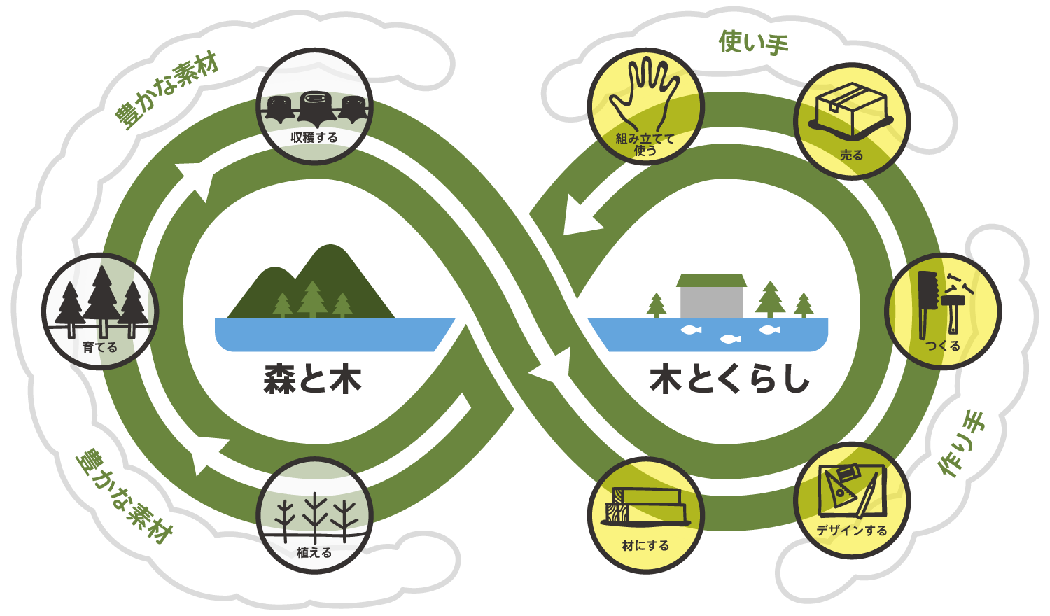 木材は日本国内に存在する数少ない再生可能な資源です。「伐って・使って、植えて、育てる」という循環型林業の基本理念は、 地球温暖化防止・森林の多面的機能の維持に直接的に作用し、私たちのこの取り組みは、SDGsの課題解決に大きく寄与することが期待されています。